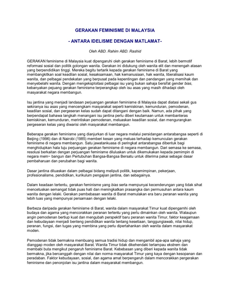 Dan golongan konservatif pun janganlah menolak mentah mentah feminisme hanya kerana ia berasal dari barat. Ada baiknya isu isu ini dijadikan sebagai naratif utama feminisme di malaysia berbanding benda benda third wave yang lebih kepada splaining golongan kelas menengah yang keliru tujuan hidup. Feminism is the cutting edge of a revolution in cultural and moral values the objective of every feminist reform from legal abortion to child care program is to undermine traditional family values ibnu hajar kitab talkhis alhabiir jilid 2 hal 56. Gerakan feminisme ini berusaha untuk membebaskan diri mereka da ripada belenggu agama dengan mendakwa peraturan a gama itu menzalimi kaum wanita dan menindas kebebasan wanita.