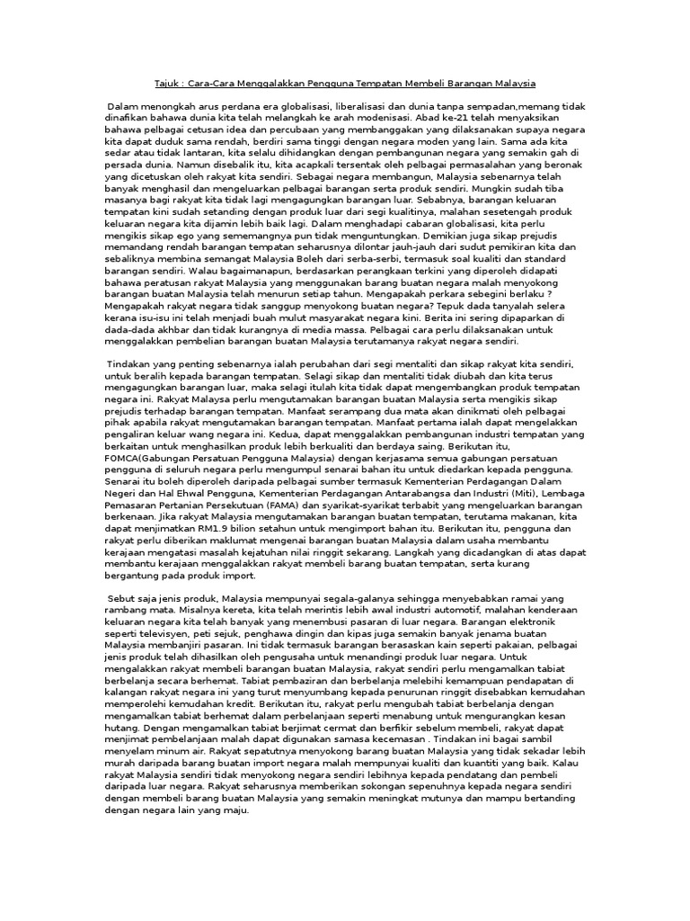 Kebaikan Membeli Barangan Buatan Malaysia Karangan Spm